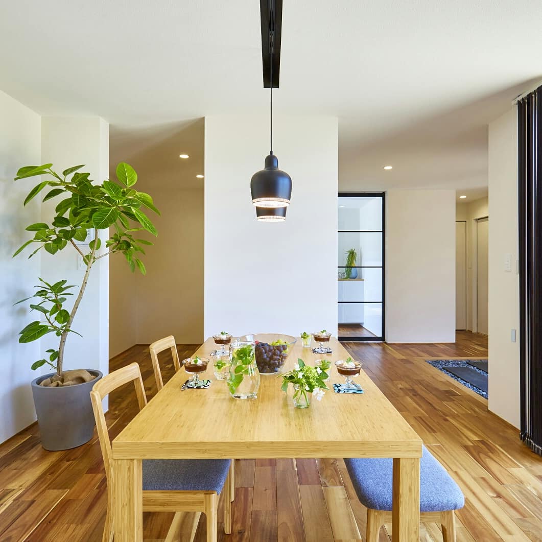 “勾配天井で広々リビングの平屋”